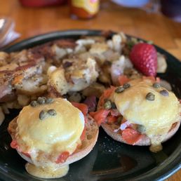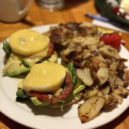 Located on 50, next to CVS, is the Swiss Chalet, Heidi's. You can't miss the BRIGHT YELLOW. My Father has been going to them since '64 and I've been going since '89. This is the go to place for breakfast, in South Lake Tahoe. Usually, there is a line, first indicator it's going to be good. When inside you see all the Swiss Culture. A very different and neat place to go to, out of the norm. The service is always awesome and the manager usually comes around and checks in. I ordered the Florentine Benedict w/their potatoes. It was awesome! English Muffin, with nice, fresh, fatty, avocado spread on top of it. Next comes the fresh, earthy, spinach, slightly cooked down. Then a fresh, sweet, juicy, tomato. Then a perfectly poached egg, just waiting for the yolk to burst out! All drenched in vibrant, tart, lemony, creamy, hollandaise sauce. They have the best Florentine around. The potatoes are done perfectly. Soft, fluffy inside, yet caramelized, crispy outside. Best potatoes/home fries around. *Love this place and I'm glad now I'm sharing it with my 3 yr old daughter. Don't change a thing*